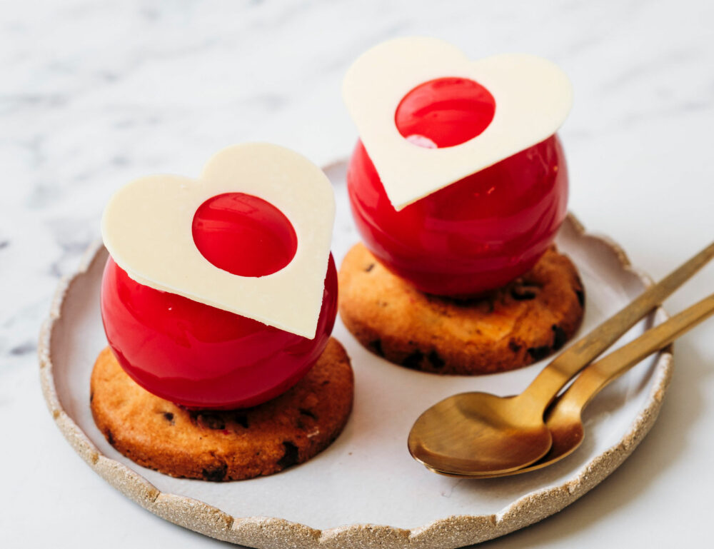 Ingrédients : Confit fraise & cerise, mousse vanille et cookie.